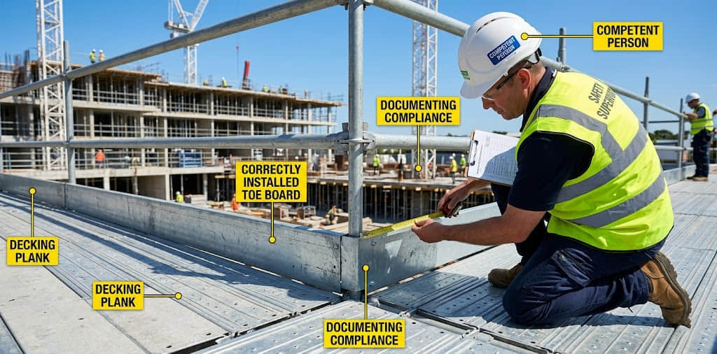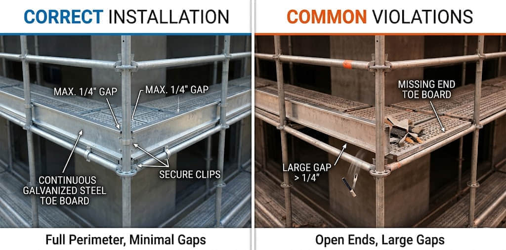 - Según la OSHA y las normas internacionales de seguridad, se requieren rodapiés en cualquier andamio que se encuentre a más de 3 metros (en algunas jurisdicciones, 1,8 metros o 2 metros) de altura sobre un nivel inferior, especialmente cuando se requiere que las personas trabajen o transiten por debajo del andamio. Si existe riesgo de que caigan herramientas o materiales sobre alguien, los rodapiés son obligatorios independientemente de la altura.