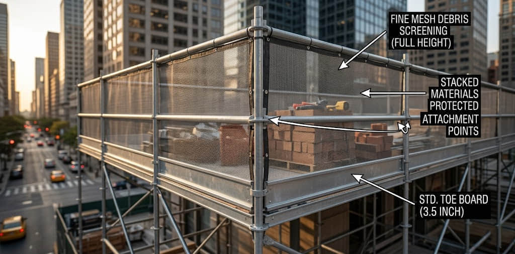 - Integración con redesEn zonas urbanas de mucho tráfico, utilice rodapiés y redes de contención de escombros (o "abanicos") conjuntamente. Los rodapiés impedirán que las cargas más grandes (es decir, los materiales pesados) caigan al suelo, y la red atrapará los materiales más pequeños (es decir, polvo y partículas).