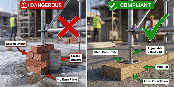 • Uncompacted Fill: Scaffolds should never be placed on "fill dirt" that has not been mechanically compacted. The weight of the structure will naturally cause the soil to settle, leading to differential settlement—where one side of the scaffold sinks faster than the other.