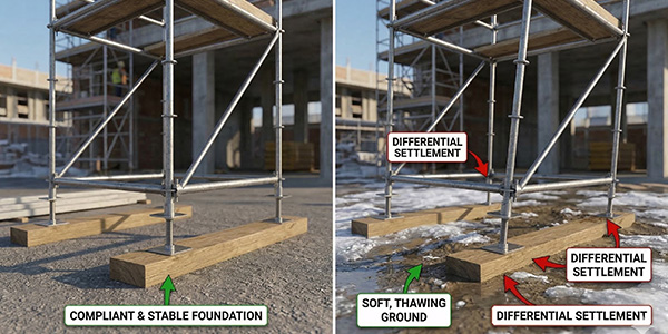 • The Thaw Hazard: In colder climates, ground that is frozen solid in the morning may feel like concrete. However, as the temperature rises during the day, the top layer turns into soft mud. A scaffold erected on frozen ground will begin to lean as the day progresses and the support settles into the thawing soil.